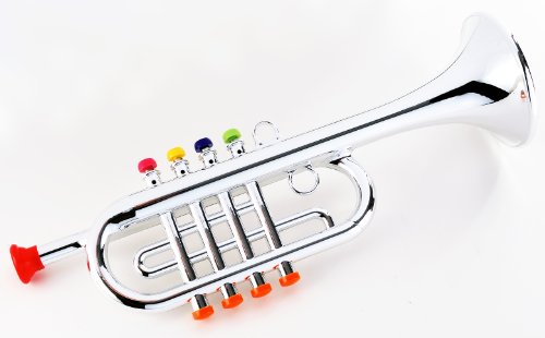 Toot your own horn with this realistic starter trumpet. Designed to replicate the look and feel of a real chrome trumpet, this kid-sized instrument features color-coded keys for easy to learn notes and songs. Blow into the mouthpiece and press the keys to produce on-key sounds. Made from phthalate-free plastic.